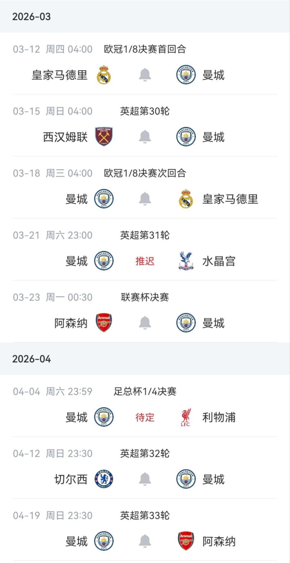按曼城的赛程,本周中欧冠1/8决赛首回合客战皇马,本周末英超第30轮客战西汉姆联,接着下周中是欧冠1/8次回合主战皇马,接着又是对阵阿森纳(客)的联赛杯决赛首回合以及足总杯1/4决赛主场迎战利物浦,好了就是英超第32轮曼城客战切尔西以及英超第33轮曼城主战阿森纳的两场联赛big6大战。