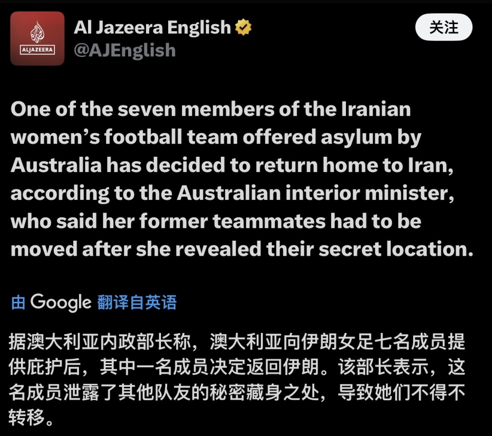 北京时间3月12日,据半岛电视台报道称,由于一名队员改变主意并向伊朗大使馆透露了她们的位置后,在澳大利亚申请庇护的伊朗女足球员已经从安全屋撤离。