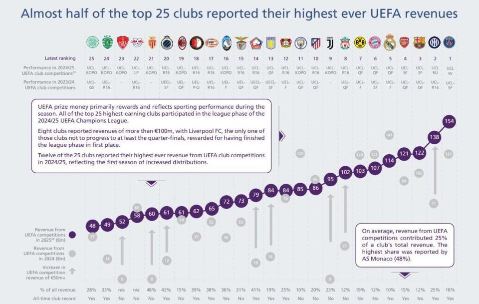 2025年欧足联给出记录,有8支队伍分到了1亿+欧元的奖励,确实是太有吸引力了。