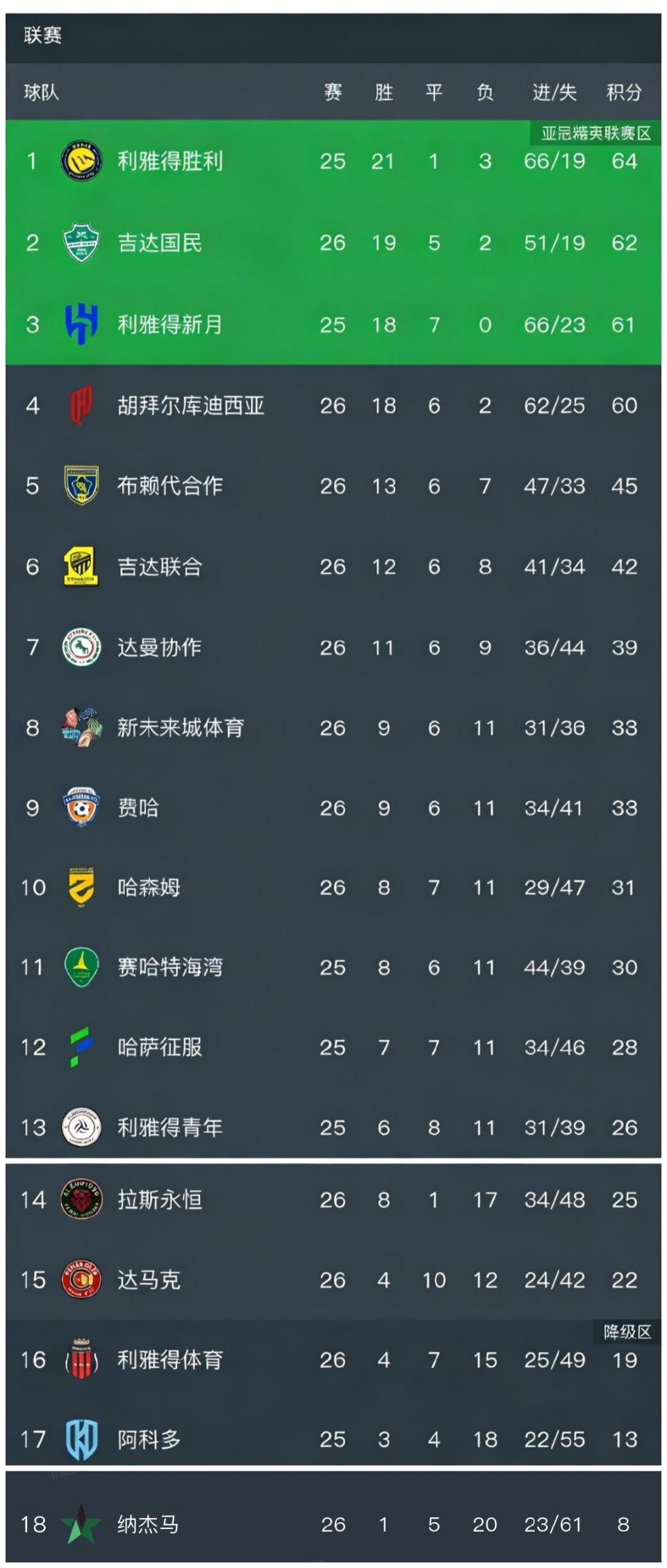 今天凌晨,沙特联第26轮结束了3场较量,吉达国民、吉达联合、达曼协作等队出战,这三场精彩的较量之后,沙特联积分榜发生变化,我们来看看。