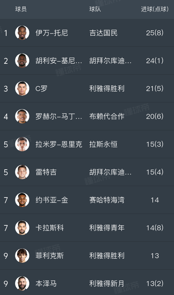 这场失利让吉达国民无缘登顶,总积分依然是62分,落后榜首的利雅得胜利2分,屈居第2名。显然,利雅得胜利取得了夺冠主动权。而在联赛射手榜,伊万-托尼继续扩大领先优势,他总共打进了25球,排名射手榜第1。C罗争夺金靴难了,他只进了21球,比伊万-托尼少了4球,比基尼奥内斯少了3球,排名第3。