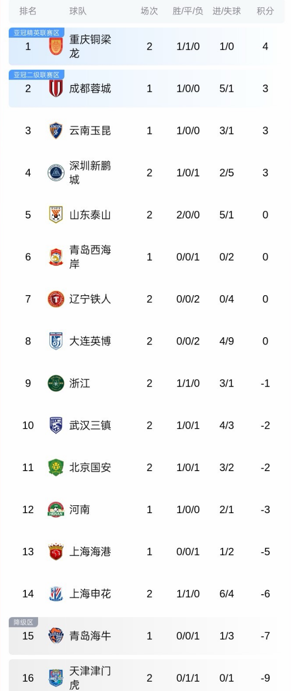 北京时间3月14日,中超第2轮继续进行,本次比赛日共有4场较量,包括万众瞩目的京鲁大战。在泰山队跟国安的比赛中,只要分出胜负,那么获胜的球队就将摆脱负分,结果泰山以2-1击败国安。现在今天的比赛已全部结束,中超最新积分榜:新鹏城1-0绝杀!泰山跌第5,榜首领先垫底队13分。