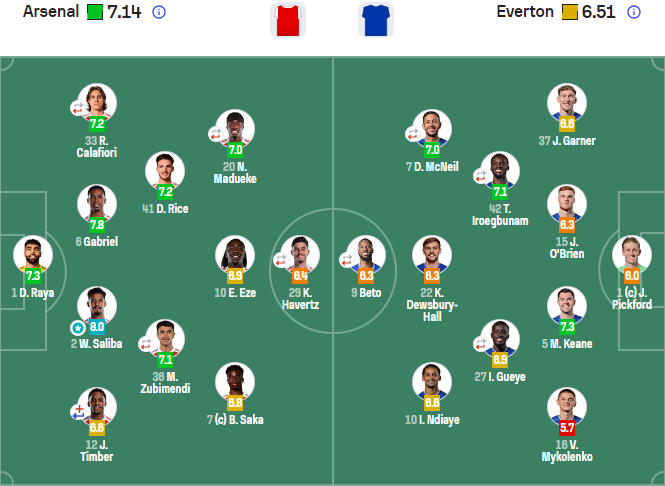 阿森纳:1-拉亚、12-廷伯(37’ 3-莫斯克拉)、2-萨利巴、6-加布里埃尔、33-卡拉菲奥里(74’5-因卡皮耶)、41-赖斯、36-苏维门迪(74’56-道曼)、10-埃泽、7-萨卡、20-马杜埃凯(61’11-马丁内利)、29-哈弗茨(61’14-约克雷斯)