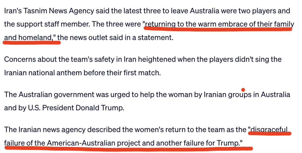 伊朗的塔斯尼姆通讯社(半官方媒体)发文,公开欢迎这3名伊朗女足成员的回国:“她们正回归家人与祖国的温暖怀抱。”同时,该媒体将4名伊朗女足成员的反悔定性为“美澳联手策划的计划遭遇了可耻的失败”、“特朗普的又一次败绩”。