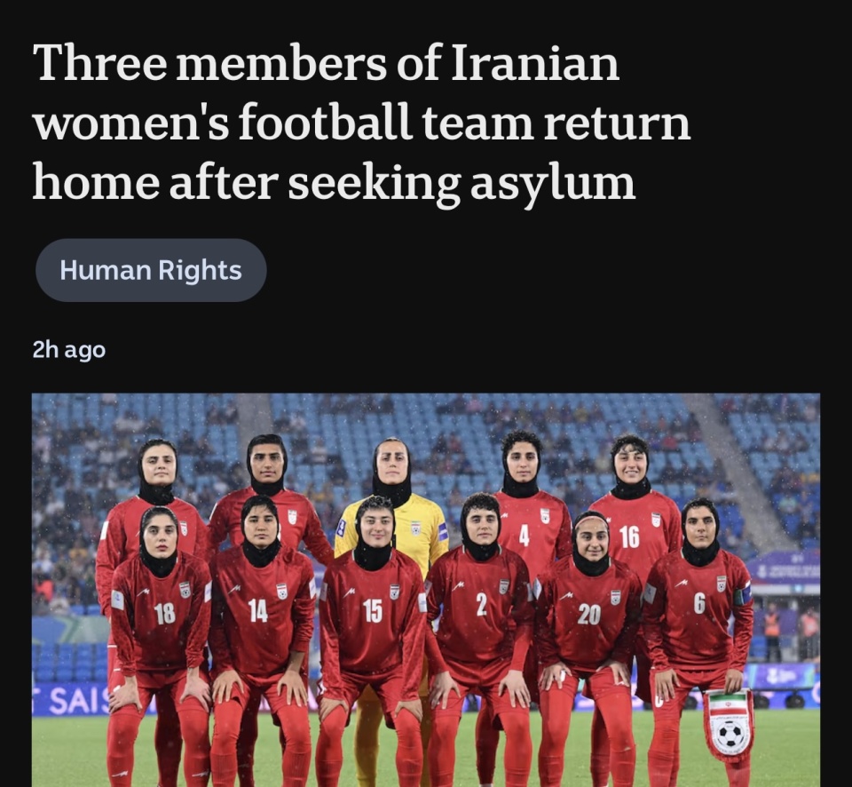 上周,澳大利亚向7名伊朗女足成员发放了人道主义签证,包括6名球员和1名后勤工作人员。不过很快,球员佐尔菲就宣布要回伊朗,而昨天,球员莫娜-哈穆迪、扎赫拉-萨巴利、后勤工作人员扎赫拉-梅什克卡尔也反悔了,决定放弃庇护,离开澳洲,返回伊朗。