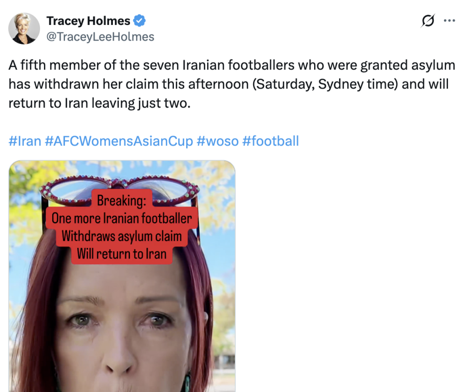 3月15日上午,澳大利亚名记Tracey Holmes在其社媒带来最新消息:“7个此前获得庇护的伊朗女足成员中,第5个撤回申请的人出现了,她将返回伊朗。目前,只有2个人还决定留在澳大利亚。”