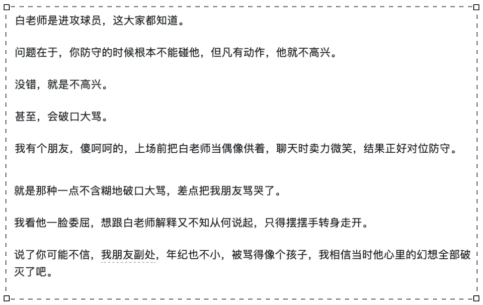 他说自己一位朋友是副处级干部,在防守中对位白岩松,而在一次突破中将白岩松撞倒,没想到白岩松起身后便“一点不含糊地破口大骂”,场面一度十分尴尬,差点将其朋友“骂哭了”。