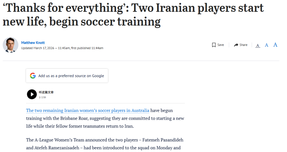 伊朗女足拒回国2人已跟随澳超队训练:感谢一切!一切都会好起来