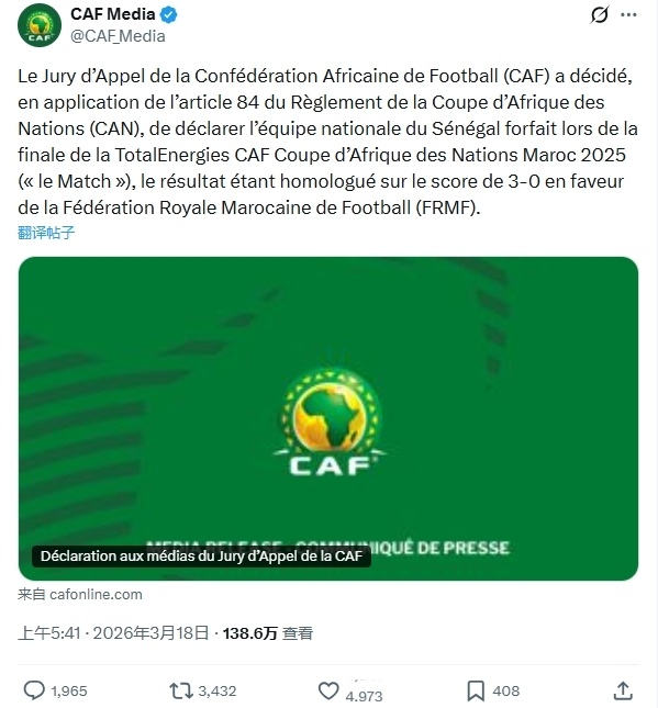 北京时间3月18日,非洲足联宣布,因为塞内加尔在决赛中一度罢赛,最终裁决他们的离场行为为弃赛,因此剥夺其2个月前夺得的非洲杯冠军,改判比赛对手摩洛哥3-0获胜。