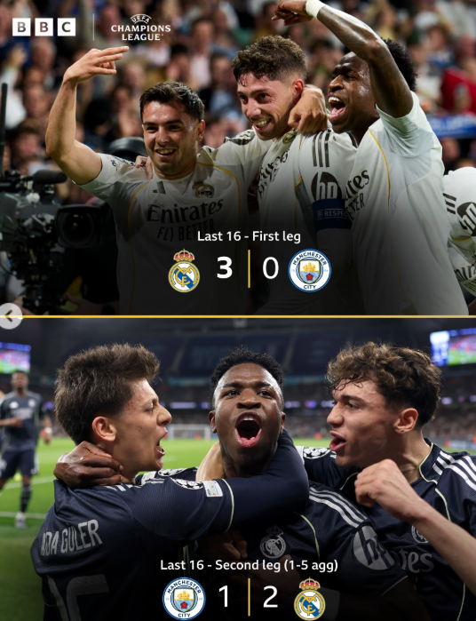 欧冠16强首回合客场0比3落后,回到主场伊蒂哈德,曼城最终还是1比2再输一场,两回合总比分1比5,被皇家马德里直接送出欧冠赛场。