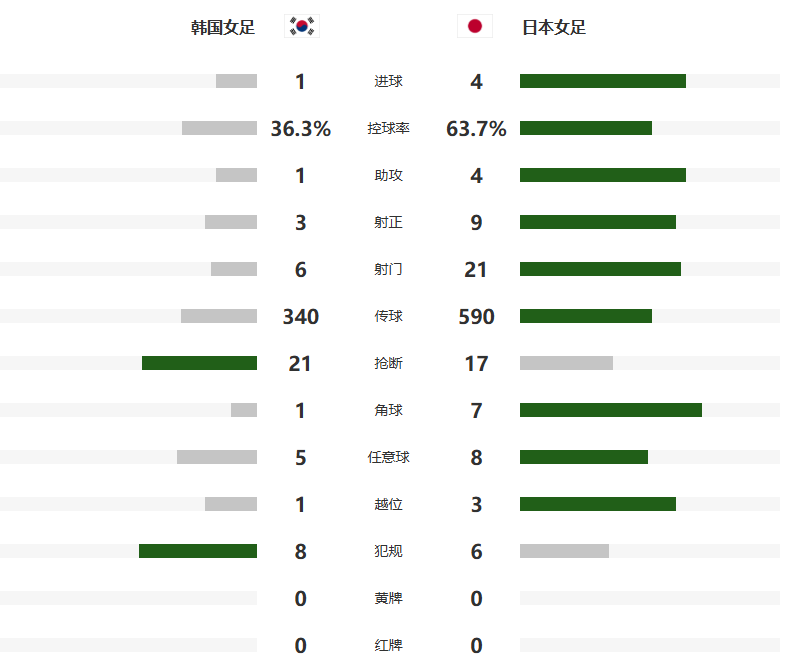 日本女足在本场比赛前4战全胜打入半决赛,打入24球的同时不丢一球。在韩日女足的历史交锋记录中,日本队以19胜12平4负占据明显优势。韩国队上一次战胜日本队是在2015年东亚杯上。