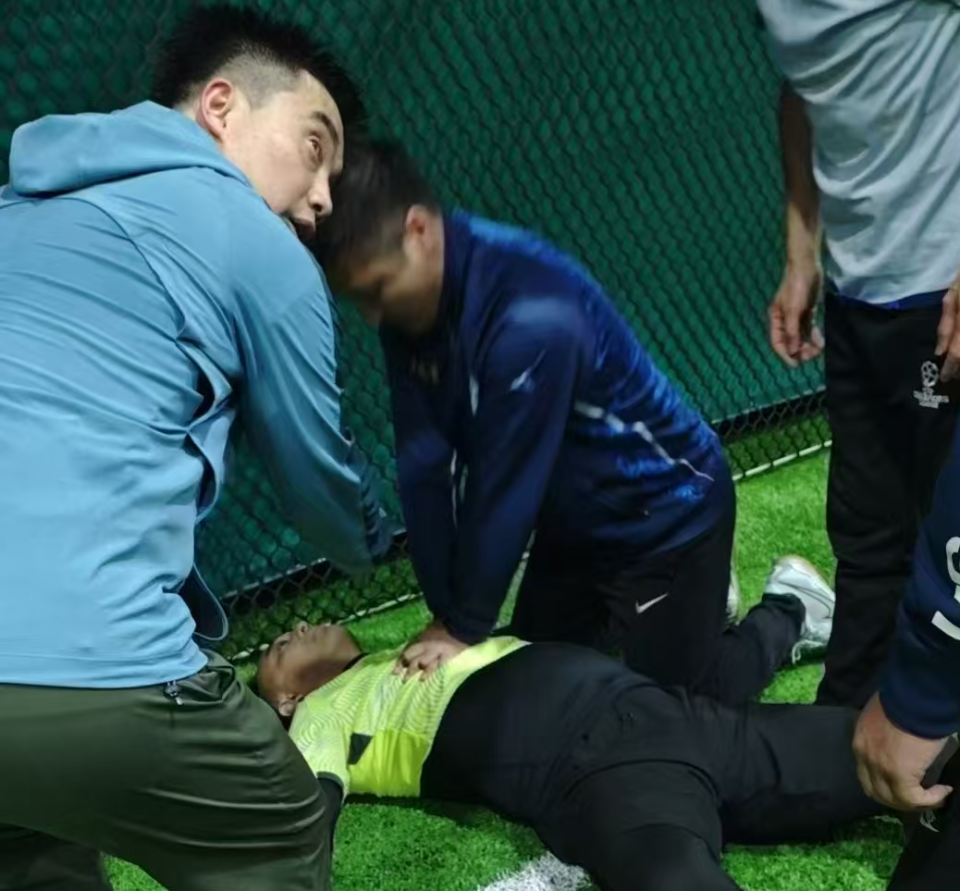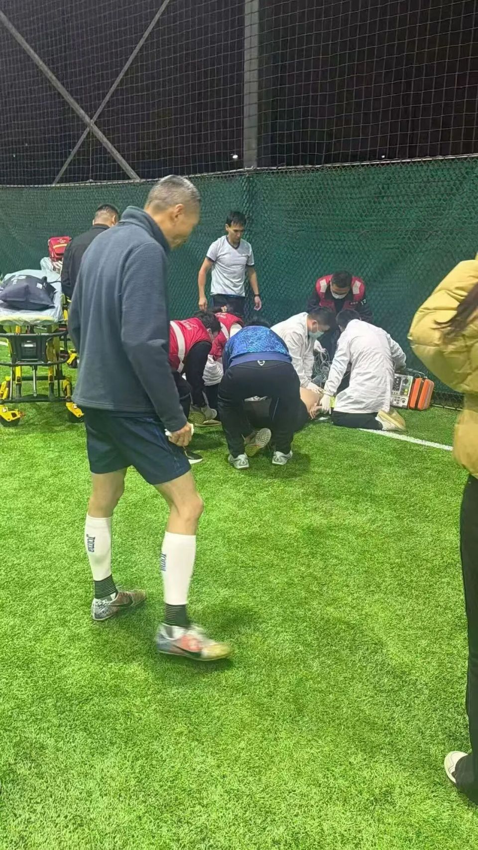 坐在球场不远处办公室里的金涛和郝铭几位球场管理人员也飞奔赶来,拿来了AED(自动体外除颤器)。有人已经拨通了120急救电话,打开视频由医生远程指导。