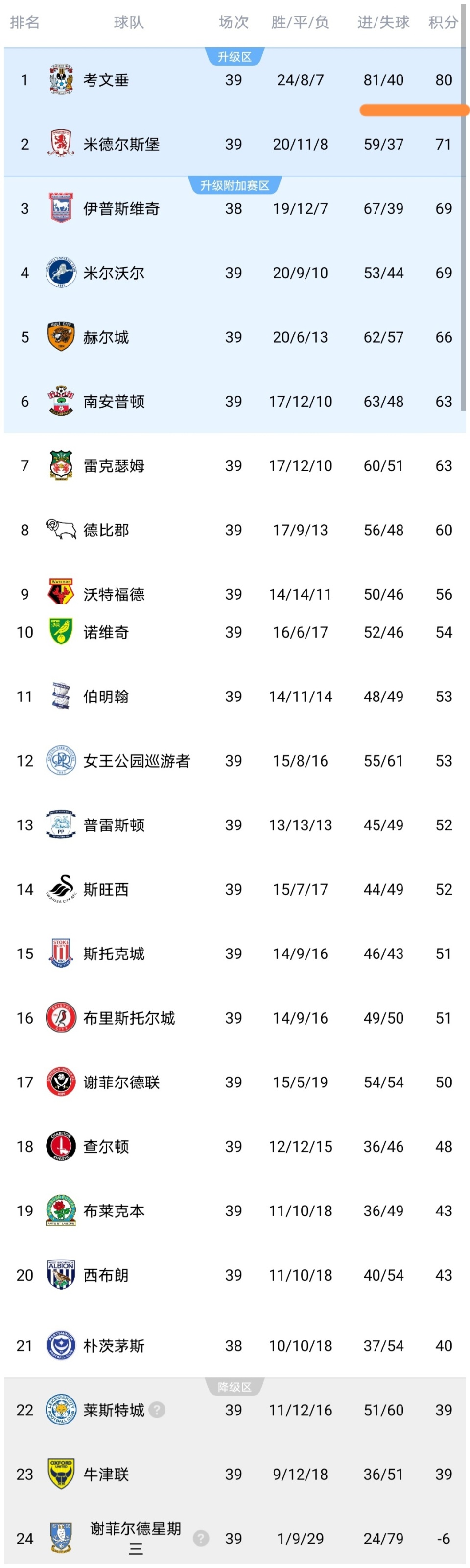 可以看到考文垂大胜斯旺西之后,积分上涨到了80分,继续领跑,而米德尔斯堡战平布莱克本之后,积分上涨到了71分,继续排名第2,而伊普斯维奇战平米尔沃尔之后,积分上涨到了69分,排名第3,而米尔沃尔排名第4,积分跟伊普斯维奇相同。