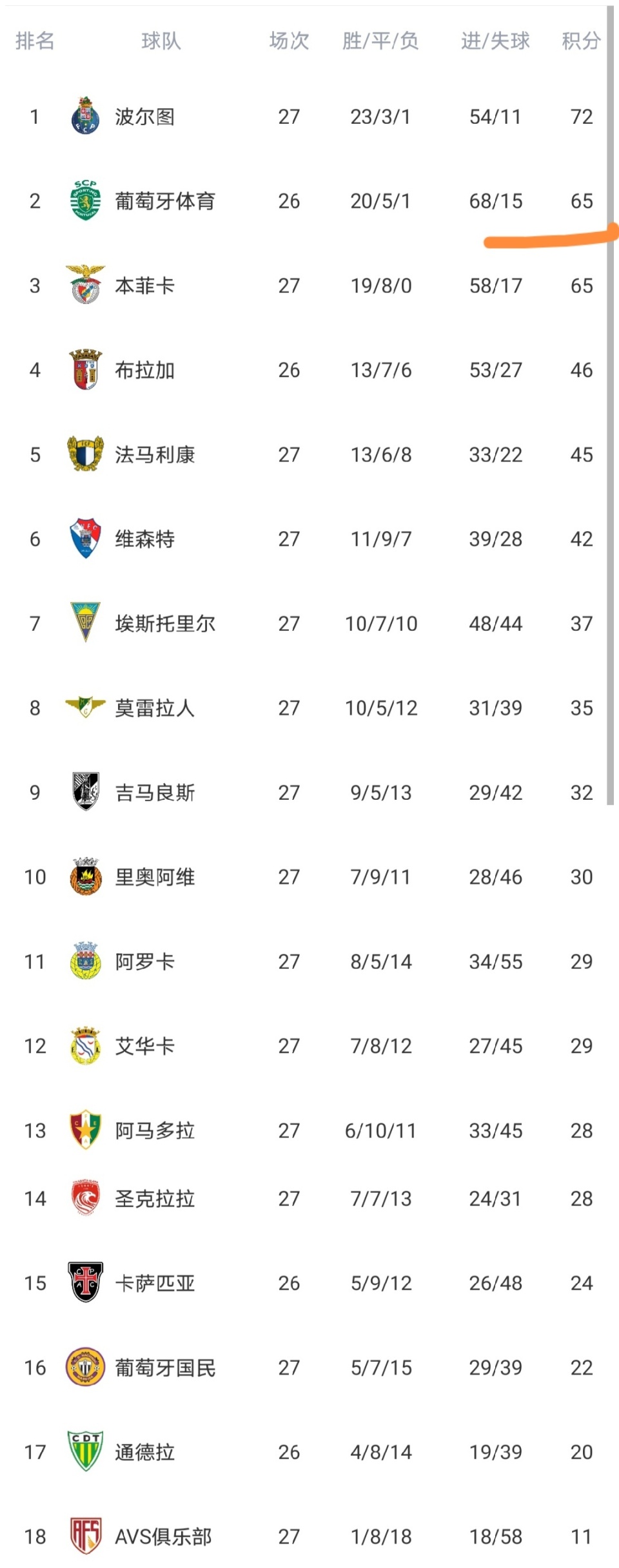 今天凌晨,葡超第27轮结束最后三场较量,穆帅头号争冠劲敌波尔图队、葡萄牙体育队等队出战,这几场较量之后,葡超积分榜发生变化,我们来看看。
