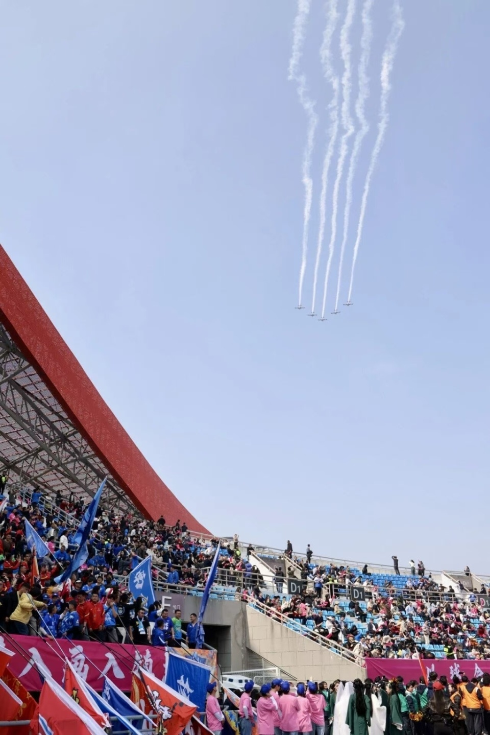 镇江“刷飞机”迎接远方来客。友谊赛前,飞行表演队在体育场上空编队通场。镇江发布供图