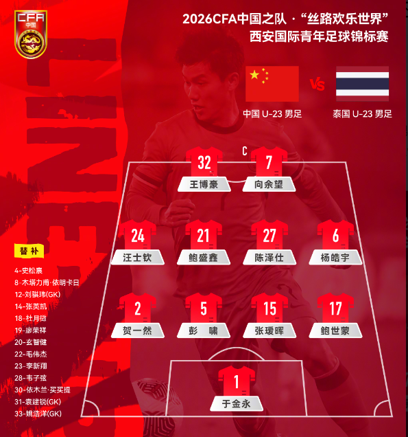 北京时间3月25日,2026CFA中国之队·“丝路欢乐世界”西安国际青年足球锦标赛展开争夺,中国U23男足对阵泰国U23男足。第3分钟,向余望击中横梁。泰国队连进两球,半场中国队0比2落后。下半场,向余望扳回一球,陈泽仕助攻李新翔扳平比分。最终,U23国足2比2战平泰国。